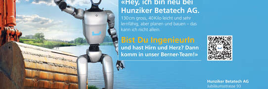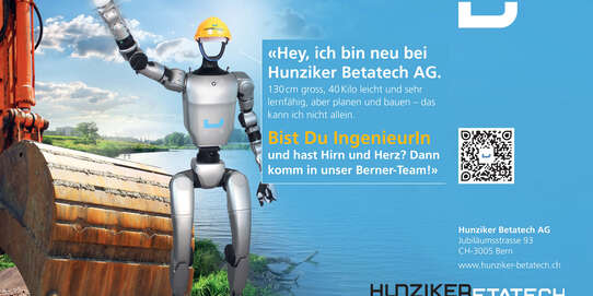 So lernt er zu gehen, zu reagieren, auf Kommandos zu antworten. Und vielleicht irgendwann wird Plix noch mehr tun: Regenbecken inspizieren, Schadstellen dokumentieren, Messdaten liefern aus Bereichen, in die Menschen nur schwer gelangen. Visuelle Inspektionen, Zustands­aufnahmen, Dichtheitsprüfungen – noch nicht jetzt, aber denkbar. Man ist gespannt. „In einen Roboter Geld und Zeit zu investieren, hat mit unserer Haltung zu Technologie zu tun – auch, wenn diese noch nicht perfekt ist, wir wollen und müssen von ihr lernen“, sagt Geschäftsführer Benjamin Lüthi. In den Medien und in der Forschung sind Themen rund um Robotik, Daten und künstliche Intelligenz allgegenwärtig. Es entsteht der Eindruck, als stünde der grosse techno­logische Umbruch unmittelbar bevor oder habe längst begonnen. Das wirkt faszinierend, manchmal auch beunruhigend. Genau deshalb will das Ingenieurunternehmen herausfinden, wie viel von diesem angekündigten Wandel uns wirklich bereits betrifft. Was ist heute relevant? Was bleibt Zukunftsmusik? Und wie gut sind wir darauf vorbereitet? Klar ist: KI entfaltet ihr Potenzial nur dort, wo die Grundlagen stimmen – strukturierte Daten, verständliche Formate, funktionierende Schnittstellen. Im Bauwesen ist das eine besondere Herausforderung. Modelle unterscheiden sich, Informationen sind verstreut, Standards oft uneinheitlich. Deshalb verfolgt Hunziker Betatech einen anderen Weg: keine fertigen Lösungen, sondern Beta-Versionen, die im echten Alltag erprobt werden. Werkzeuge, die mit der Praxis wachsen dürfen. Und mittendrin: Plix. Ein lernendes System, das sich nicht nur durch Datenwelten bewegt, sondern sie auch strukturiert erfasst und darin handlungsfähig wird.