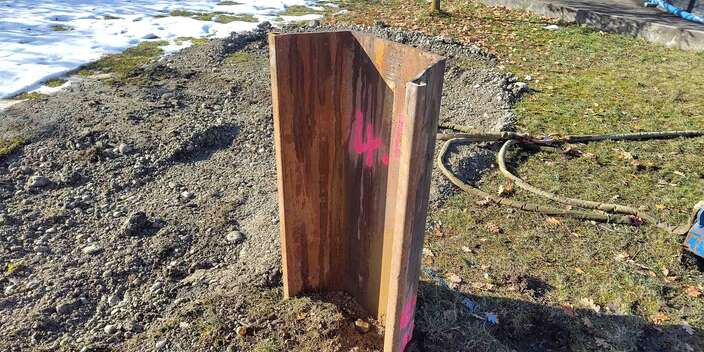 • Einbringung: Vier Einzelbohlen vom Typ PU 28, Stahl S355, Länge je 14 Meter (geteilt in 2x 7 Meter).