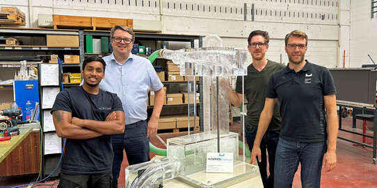 An unserem Kundenanlass «Blaue Zukunft: Wenn Algorithmen Wasser bewegen» konnte das Modell begutachtet werden – das Interesse war gross, die Rückmeldungen durchwegs positiv. Das transparente Modell machte Strömung, Luftführung, Wirbel und die damit verbundene Ingenieursarbeit auf eindrückliche Art sichtbar.