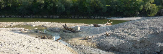 Als bestmögliche Lösung wurde ein flacher, breiter Deltabereich mit einem kurzen und steilen Rauhgerinne-Beckenpass befunden. Diese Bauweise ersetzt das frühere Absturzbauwerk und ermöglicht Fischen wieder den Aufstieg. Gleichzeitig entstand ein strukturreicher Übergangsbereich mit Kiesflächen, Seitenarmen und unterschiedlichen Wasserständen – wichtige Voraussetzungen für vielfältige aquatische und terrestrische Lebensräume. Auch der angrenzende Wald wurde ökologisch aufgewertet und mit auentypischen Gehölzen ergänzt.