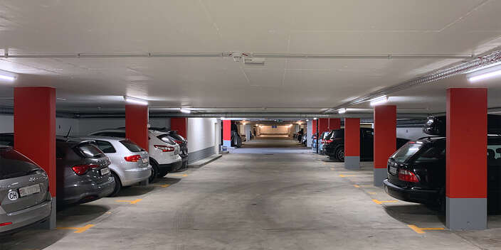 Auch die Tiefgarage unter den gedeihenden Grünflächen hat durch das Projekt gewonnen. Wir haben ihr einen durchdachten, farbenfrohen, hellen Farbanstrich verpasst, die Lichttechnik wurde erneuert, Ladestationen für Elektro-Autos installiert und das Brandschutzkonzept überdacht und umgesetzt.
